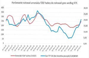 - w produkcji nawozów azotowych najważniejszym czynnikiem kosztowym jest cena gazu ziemnego, który stanowi 50-70% kosztów produkcji (w zależności od rodzaju nawozu). Ceny gazu w Polsce należą do wysokich w skali Unii Europejskiej, a w zestawieniu z ceną gazu producentów rosyjskich są – w zależności od okresu – ponad 2, a nawet 3 krotnie wyższe. Kluczowym stały się ostatnie dynamiczne wzrosty cen omawianego surowca, co zostało przedstawione wraz z trendem wzrostowym kosztów amoniaku (wykres 1)