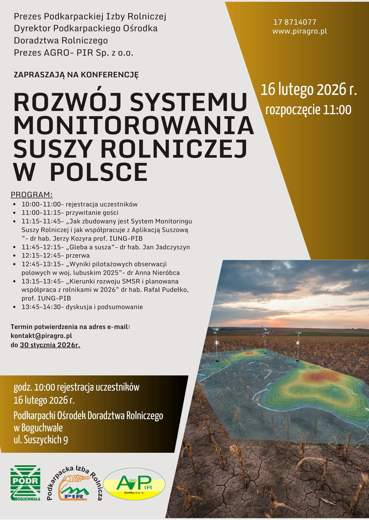 Zapraszamy na konferencję pod nazwą „Rozwój systemu monitorowania suszy rolniczej w Polsce”, która odbędzie się 16 lutego br. w Podkarpackim Ośrodku Doradztwa Rolniczego w Boguchwale. Potwierdzenia udziału w konferencji zgodnie z zaproszeniem przyjmowane będą na adres e-mail: kontakt@piragro.pl w terminie do 30 stycznia 2026 r. Szczegóły na plakacie poniżej.